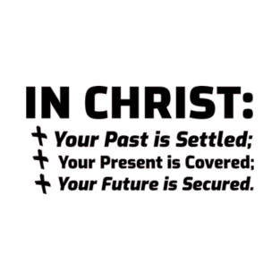 In Christ Your Past is Settled; Your Present is Covered; Your Future is Secured. Black lettering. Christian design for any product. Great gift idea for your Christian family, friends, coworkers.